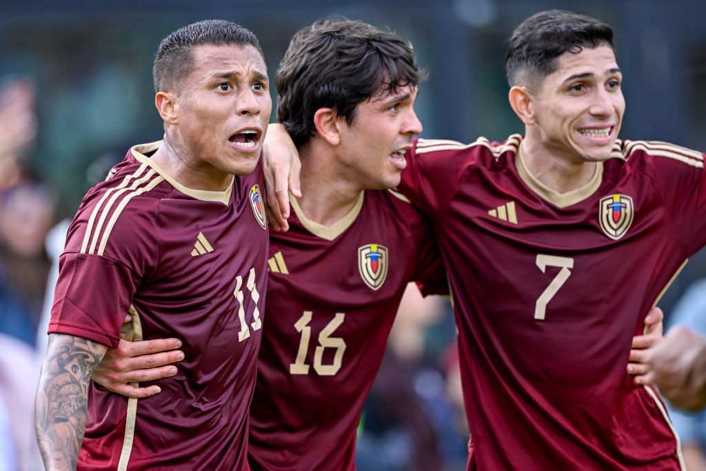 FT. LAUDERDALE, FL - MARCH 21: Venezuela's Darwin Machins (11) celebrates scoring a goal with Jon Aramburu (16) and Jefferson Savarino (7) during the Italy vs. Venezuela International Friendly match on March 21, 2024, at Chase Stadium in Fort Lauderdale, Fla. (Photo by Doug Murray/Icon Sportswire via Getty Images)
